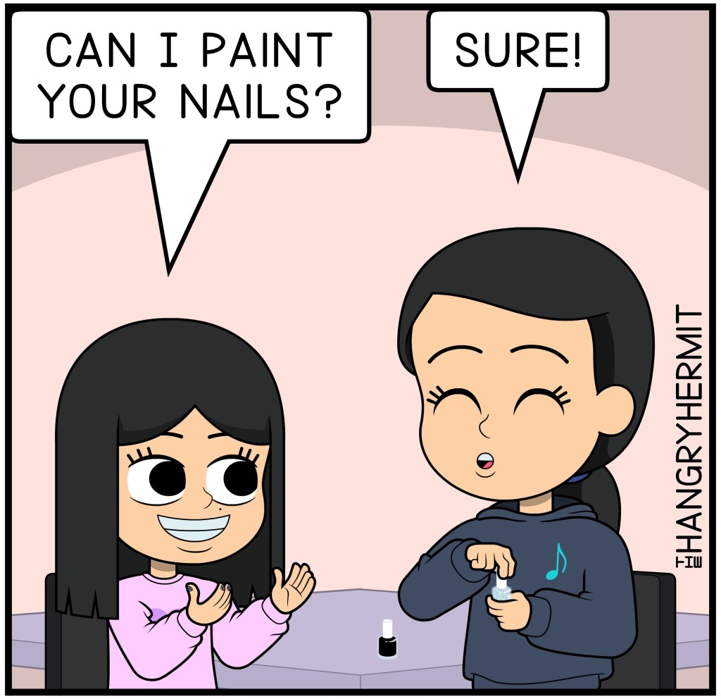 Nail Art Part 2 September 27, 2023 ~ The Hangry Hermit ~ Leave a comment Who doesnโt want their nails painted? ๐ Share this: Click to share on Tumblr (Opens in new window) Tumblr Click to email a link to a friend (Opens in new window) Email Click to share on Facebook (Opens in new window) Facebook Click to share on X (Opens in new window) X Like Loading...
